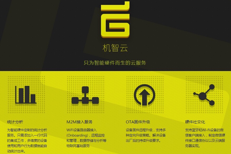 通过Open API让智能硬件接入社交网络;向开发者免费开放智能硬件统计分析平台及蓝牙4.0BLE SDK;推出机智云2.0自助平台和智能硬件开发板