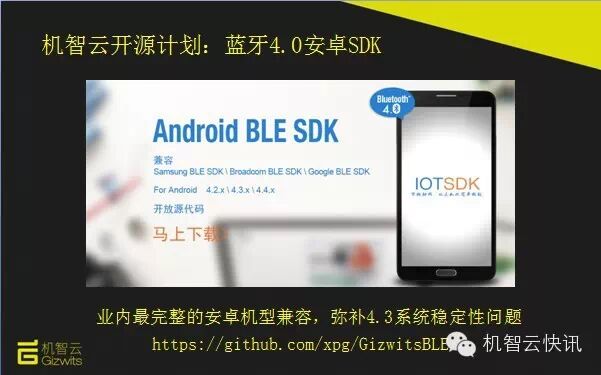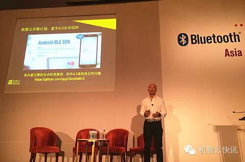 机智云)作为本次蓝牙大会的唯一软件合作伙伴也应邀出席,除在大会邀请的展示区展出机智云最新产品和应用外,在技术专题研讨演讲中机智云CEO JACK分享了《智能硬件的云服务攻略》主题演讲,并率先向开发者发布免费的蓝牙4.0安卓SDK。