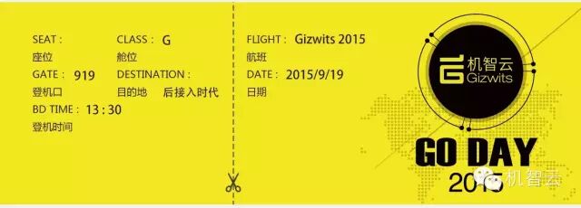 温馨提示: 航班号:Gizwits 2015 登机日期:2015年9月19日(周六) 登机时间:13:30 登机口:919 起飞地点:繁星戏剧村(北京市西城区抄手胡同64号,宣武门地铁A2出口即到) 目的地:后连接时代 飞行时间:狂欢8小时