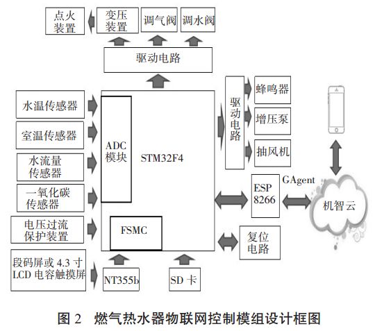 2 物联网控制模组的设计 本方案以 STM32F407ZGT6 为主控模块,结合水温信号、水流量信号、一氧化碳检测信号等信号数据,通过 ESP8266 WIFI 模块与机智云平台构成物联网系统,可使用手机 APP 设定热水器控制与设置参数,设计框图如图 2 所示。