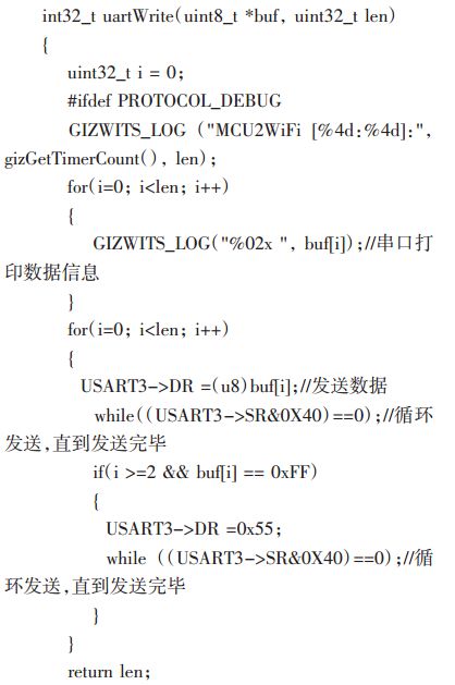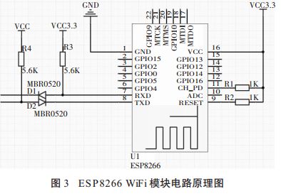 2.1 WIFI 模块 WiFi 模块采用低功耗、高集成度的 ESP8266,该模块高度集成 8M 存储器、射频 balun、天线开关、过滤器和功率放大器,时钟速度最高达 160 MHz,具有超低功耗的 16 位 RSIC[2]。ESP8266 支持实时 RTOS操作系统,WiFi 协议栈只占用 20%的 MIPS,剩余的80%可用于开发与编程。烧写 GAgent 固件后,可以提供上层应用(手机 APP 等控制端、云端)与互联网燃气热水器进行双向数据通讯,其电路原理图 3 所示。ESP8266 广泛应用于电气设备、移动通信终端等领域,通过串口与 MCU 连接,可实现多应用场景的超低功耗运行,能满足本方案对功耗控制的严格要求。本设计中,WiFi 模块和 STM32 通过串口通信,在手机 APP 上可实现对燃气热水器的出水温度、出水量等参数进行预设,将数据上传至机智云平台,并能从机智云平台服务器获取相应的控制信息。WiFi 模块进行数据收发所调用 STM32 函数的主要内容如下: