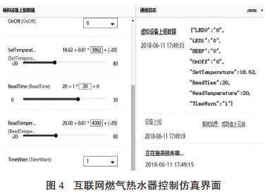 2.2 机智云平台设置 机智云平台面向网页控制端及手机 APP 提供的应用程序编程接口 API 具备代码自动生成功能。云平台会根据本设计方案定义的数据节点生成对应的设备端代码,降低了开发者的开发门槛和开发资源调用,缩短开发周期。设备端代码实现了机智云通信协议的解析与封包、传感器数据与通信数据的转换逻辑,并封装成了简单的 API。当互联网燃气热水器WIFI 模块收到云端或 APP 端的数据后,程序会将数据转换成对应的事件并通知到应用层,开发者只需要在对应的事件处理逻辑中添加对应设备的控制函数,就可以完成产品的开发。机智云官网的开发者中心为本设计方案提供虚拟的互联网燃气热水器物联网控制模组,可模拟设备上报数据和快速校验接口功能开发情况。同时,利用机智云平台提供的手机APP 扫描该虚拟设备自动生成的二维码后,可在手机上对虚拟设备进行控制仿真,检查虚拟设备与云平台数据通信可靠性,本设计方案开发过程中的控制仿真界面如图 4 所示