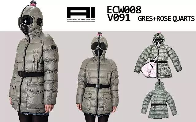 羽绒服采用高科技衣料打造,具有很强视觉冲击力的单品,乍看似乎平平无奇,实质拉上拉链后变化身蒙面超人,兜帽为耳鼻都留出透气孔,眼部能通过透明材质看清外面环境。