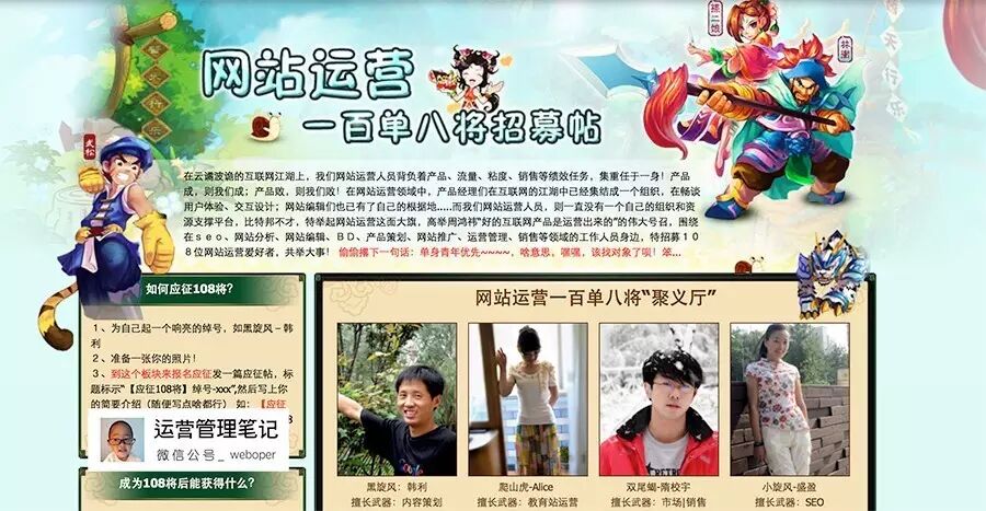 我觉得江湖儿女少不了美女,古龙的小说里美女的篇幅相当高,这可能是古龙小说受欢迎的原因之一。所以我需要找到这些美女做冷启动。然后你就看到了我写的那些故事了,其实她们都是有原型的,我一个个约聊,把她们都说服了,要了照片,其中大部分是我的同学和老同事。 后来,我盯上了公司里的姑娘们,我发现她们天然具有一种诱惑力,带有“饵”的气质。于是和她们套近乎,没事就帮她们把工作都做了,久而久之,她们也就把照片都给我了。 后来一帅哥发现了这个事,也非要上网站运营108将聚义厅页面,还想排第一。我说你给我介绍几个漂亮姑娘我就把你排到第一的位置上,他非常高兴,1天不到就给我拿回来6张照片。 这养成了我每跳槽到一家新公司,先看我能下手的美女多不多的毛病。 2、文字上体现“范”