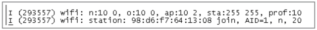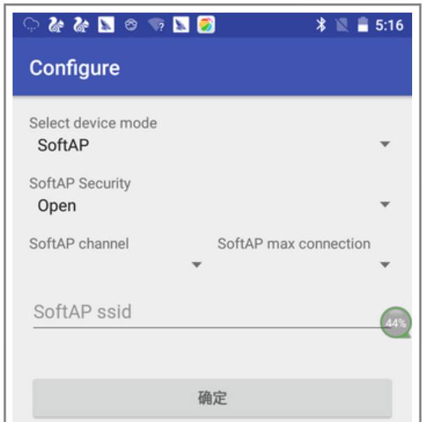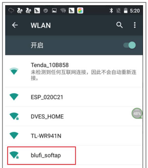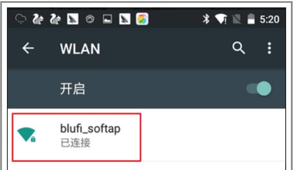 同时,串口工具中会出现如下图中的打印: 以下为 SoftAP 模式的配置示例: 如同上一个示例的步骤 1-4 所示,用户将模组上电,通过手机 app 与 ESP-32S模组进行蓝牙后,进入配网界面选择 device mode 为 SoftAP 模式,界面如下: 选择配置 SoftAP 的相关参数,包括信道,加密方式,可连接的 STA 最大个数,并填写 SoftAP 的 SSID 以及密码。点击“确定”按钮,进行 SoftAP 配置。 配置成功后,如下图所示:(此界面上显示了当前设置的模式,以及当前 SoftAP 的连接状态) 同时,在串口工具中会显示如下打印: 打开手机 Wi-Fi,可以搜索到已设置的 SoftAP,如下图所示: 将手机 Wi-Fi 连接此 SoftAP,出现“网络已连接”提示,如图: