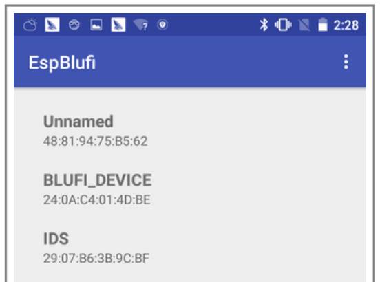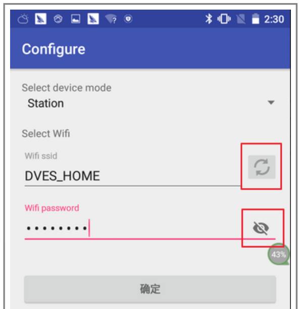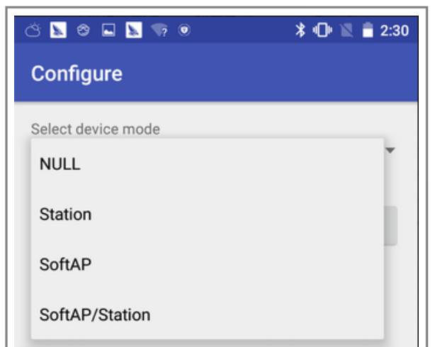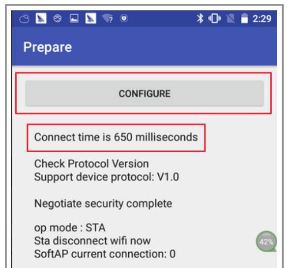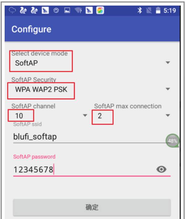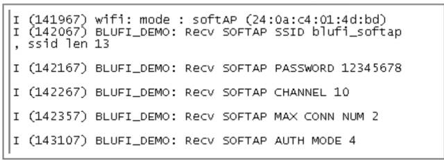 具体操作: 首先介绍 Station 模式的配置示例: 给模组上电,可通过串口工具看到如下打印: 打开手机上的 app,在 app 界面上下拉刷新,可以看到周围的蓝牙设备,如下图所示: 在刷新后界面显示的一系列蓝牙设备中,点击 ESP32 模组,进行蓝牙连接。如连接成功,则跳转到如下界面。红色框中为从蓝牙连接到协商通过所需时间(此时间显示为演示专用)。连接成功后的界面还会显示 BLUFI 协议版本(比如下图中,协议版本为 V1.0);显示当前的 Wi-Fi 模式 (Station/SoftAP/Station+SoftAP),并且分别显示 Station 模式下的连接状态(比如下图中,为 disconnect 状态)以及 SoftAP 模式的当前连接数(比如下图中,为 0)。 同时,串口工具中会出现如下图中的打印: 在此界面上,如无法出现 CONFIGURE 按钮,或 CONFIGURE 按钮无法点击,则说明蓝牙连接失败。 点击 CONFIGURE 按钮,进入配网界面。如下图所示: 点击下拉箭头,选择 device mode(BLUFI 配网支持 Station/SoftAP/Station+SoftAP 这三种模式)。如下图所示: 在下图界面中,以配置 Station 模式为例,点击右侧的刷新按钮,选择需要的 SSID,并填写对应的密码: 点击“确定”按钮进行配网。如成功,则出现如下界面。红色框中为配置完成到 Wi-Fi 连接成功所需时间。同时将显示配置完成后 Wi-Fi 模式(本例中,SoftAP 没有开启,所以显示依旧是 Station 模式)的 Station 的连接信息(如下图,有 AP 的 BSSID 和 SSID 信息,以及连接状态等)。