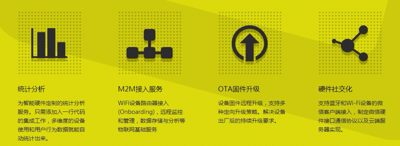 智能硬件设备接入云端后,机智云智能硬件开发平台免费为开发者提供智能硬件统计分析、硬件社交化、设备固件远程升级等服务,让开发者更好地跟踪设备使用情况,接入微信等社交网络,设备固件通过网络直接进行远程升级。开发者进入机智云后台通过快速的设备功能定义后,云端自动生成设备通信协议、虚拟设备、Demo App以及手机端的SDK,只需简单集成即可完成一款智能设备开发,大大降低了智能设备开发的难度。